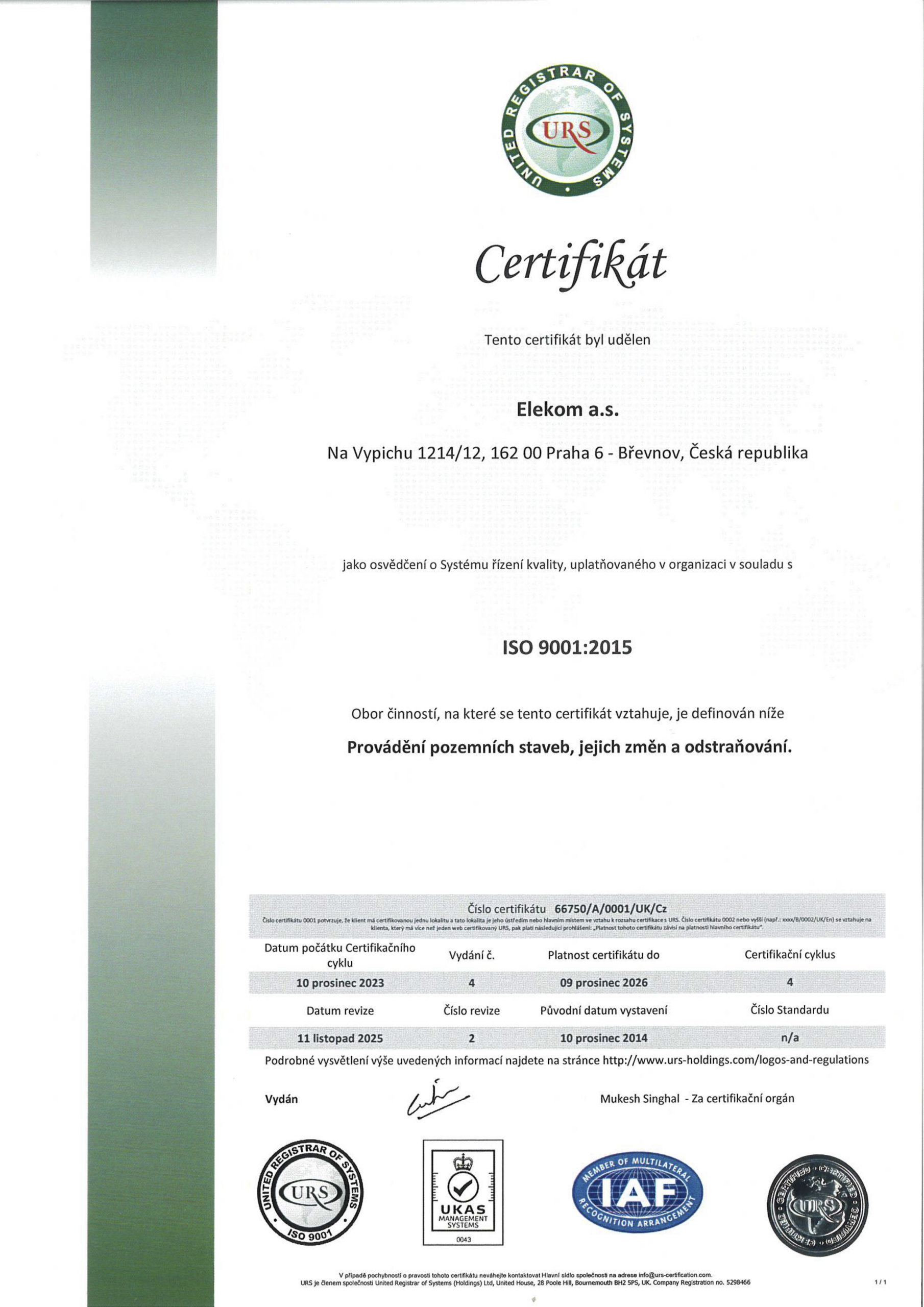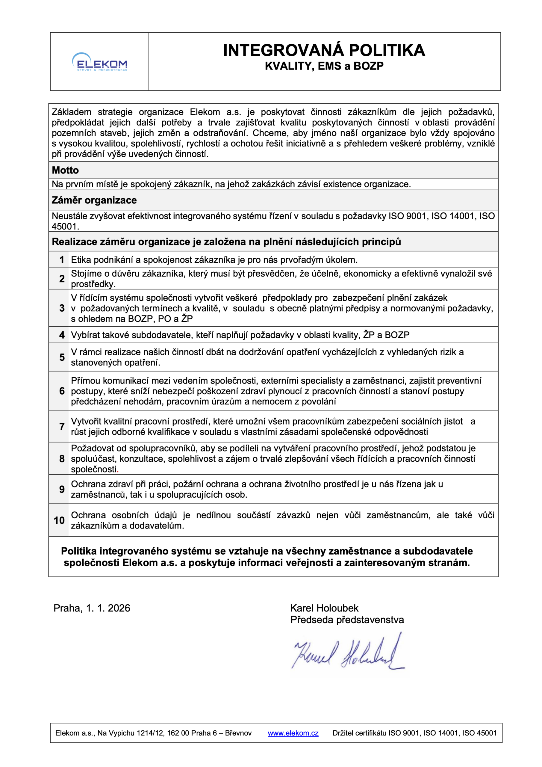 Společnost Elekom a.s. dlouhodobě staví na kvalitě, bezpečnosti a odpovědném přístupu ke svým zákazníkům, zaměstnancům i okolnímu prostředí. Tyto hodnoty jsou potvrzeny mezinárodně platnými certifikacemi integrovaného systému managementu: