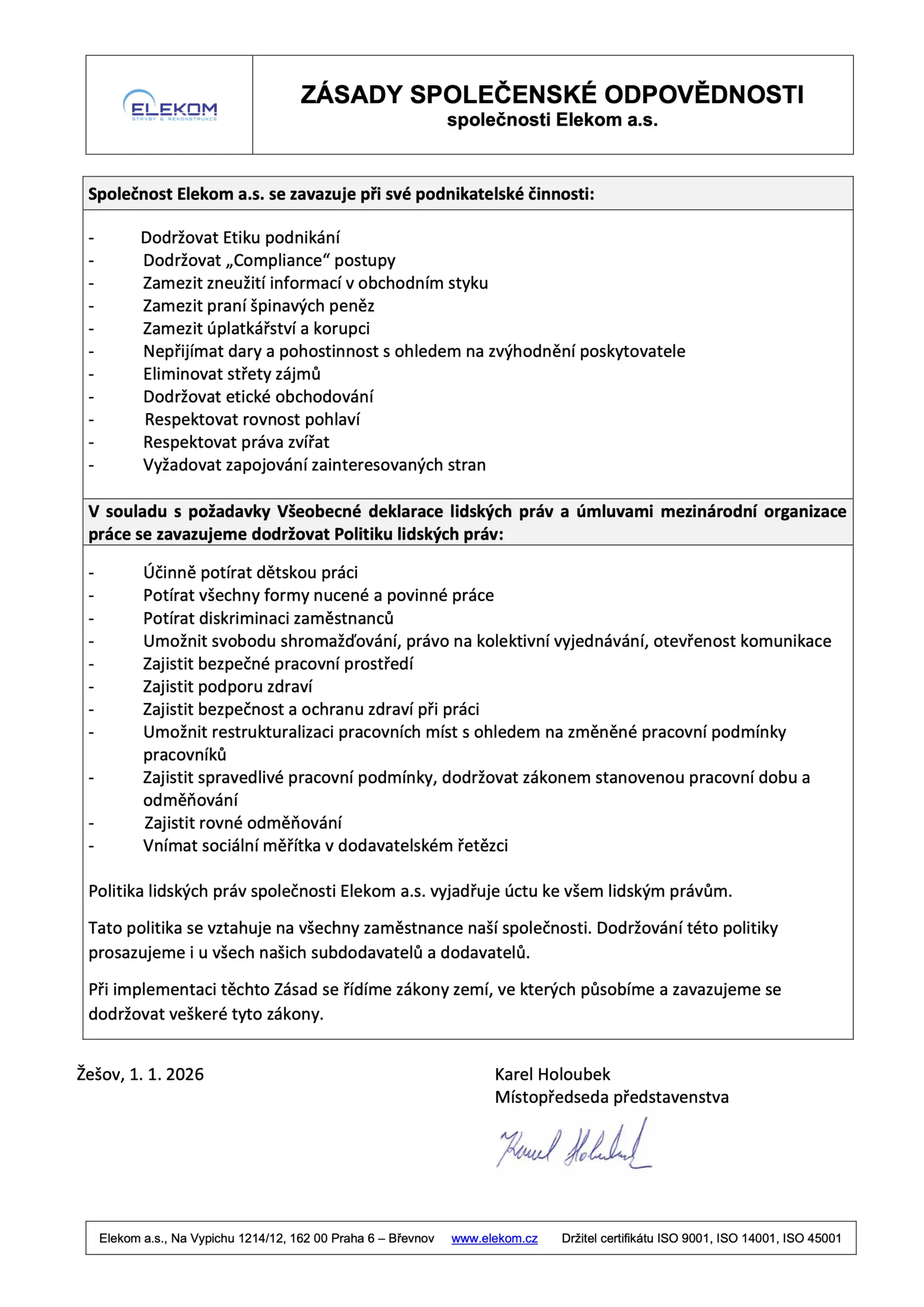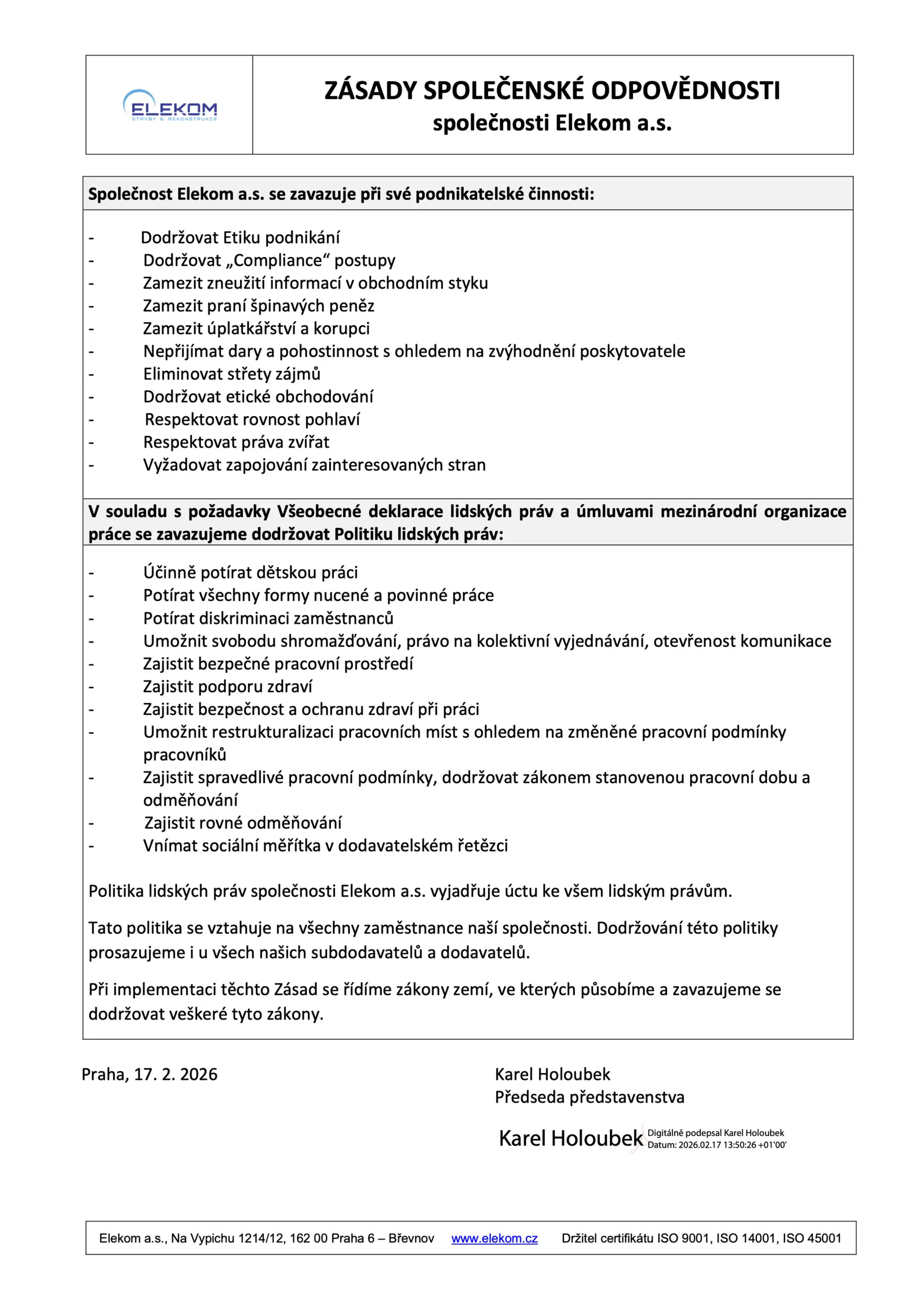 Součástí našich hodnot je také společenská odpovědnost a etické podnikání. Společnost Elekom a.s. se při své činnosti zavazuje dodržovat Politiku lidských práv v souladu s Všeobecnou deklarací lidských práv a úmluvami Mezinárodní organizace práce.